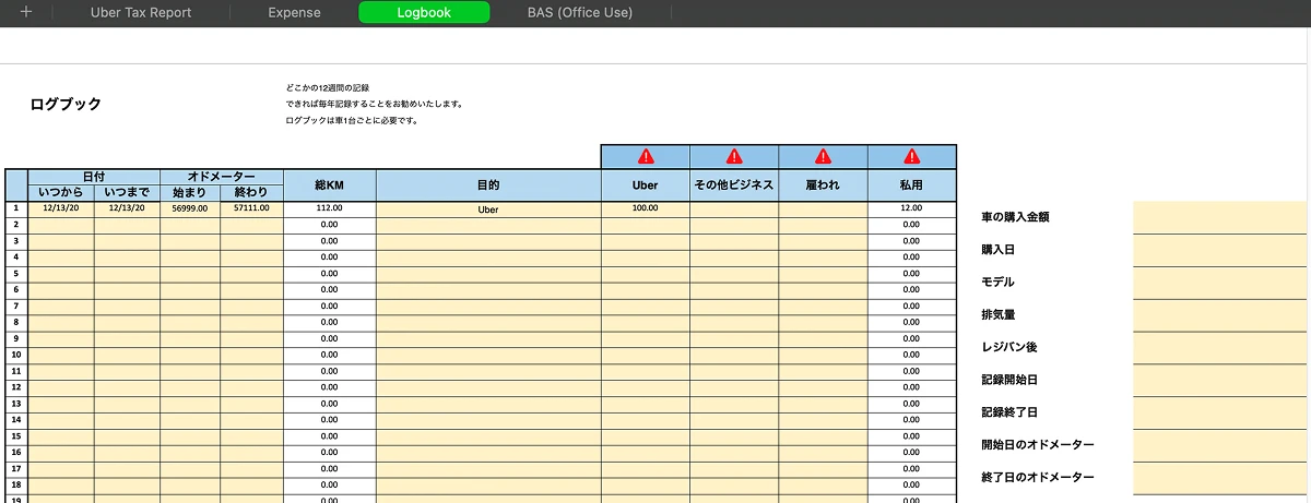 Ezy Tax Solutionsでは、Uber Eatsなどに役立つ記録用シートも準備されています。