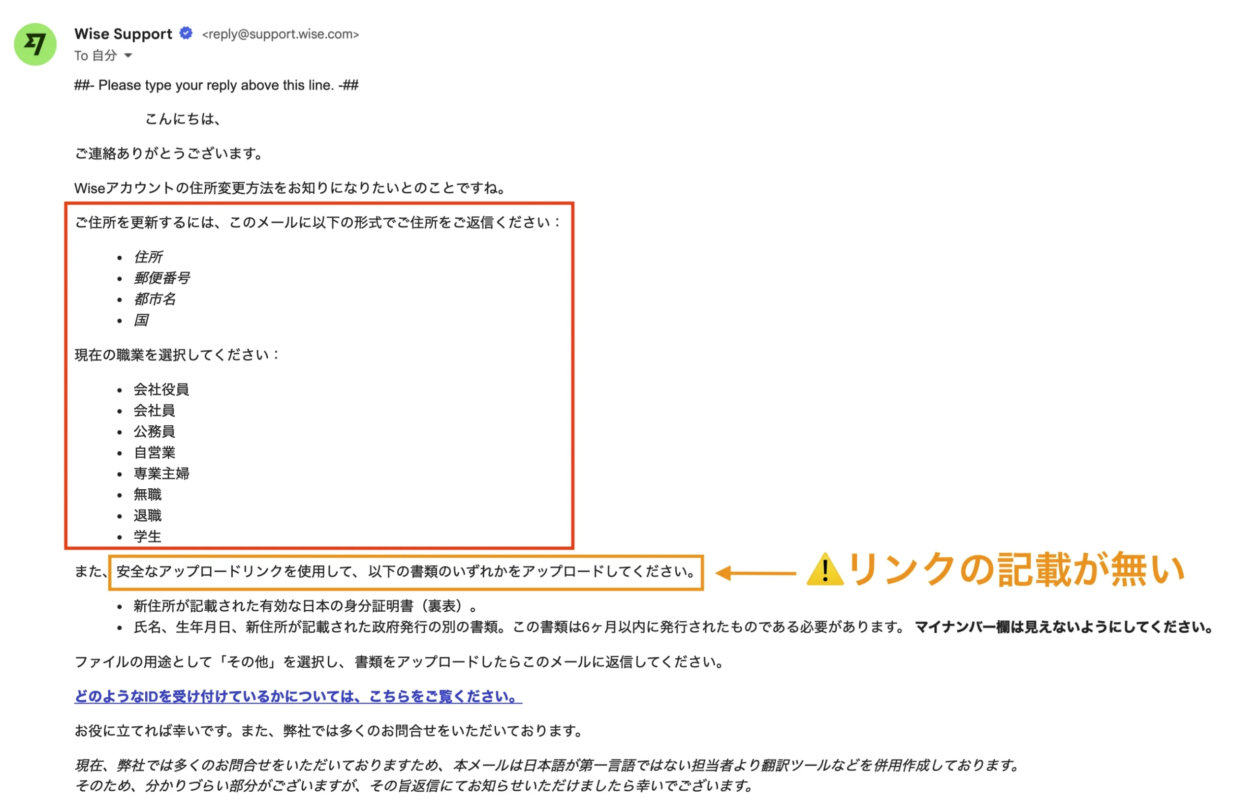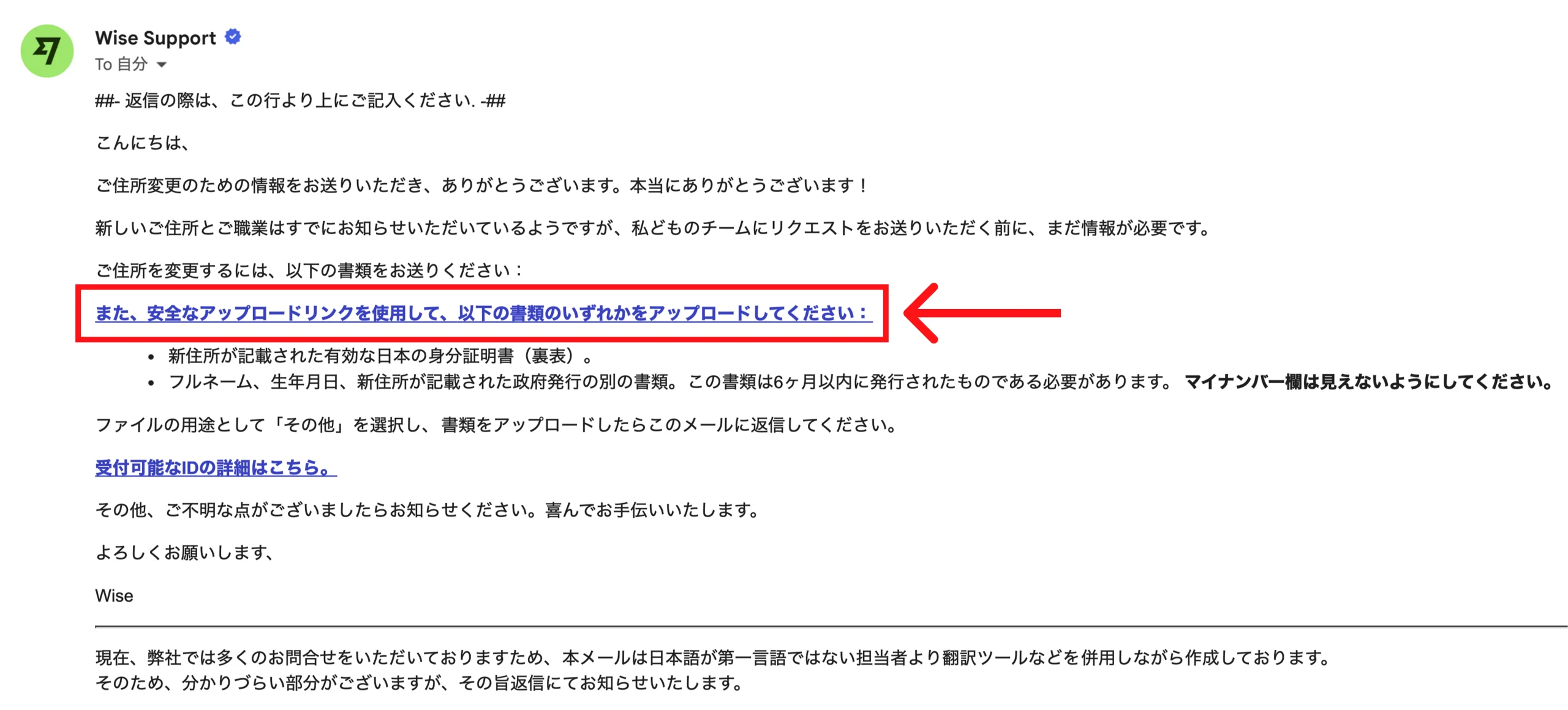 ボクホリ初めからWiseサポートからのメールに「安全なアップロードリンク」が記載されていなくとも、変更したい新しい住所を伝えればリンクを添付し、再送してくれるはずです。