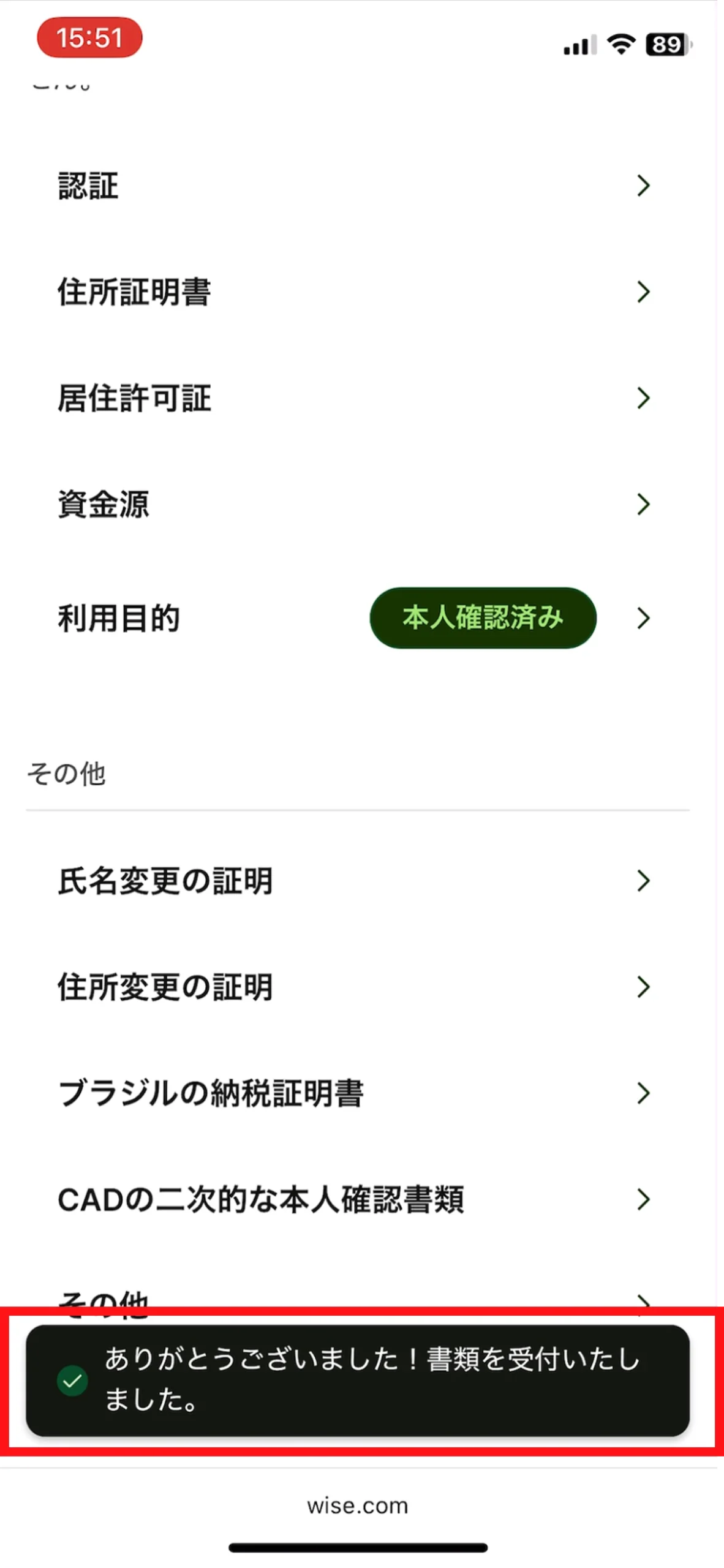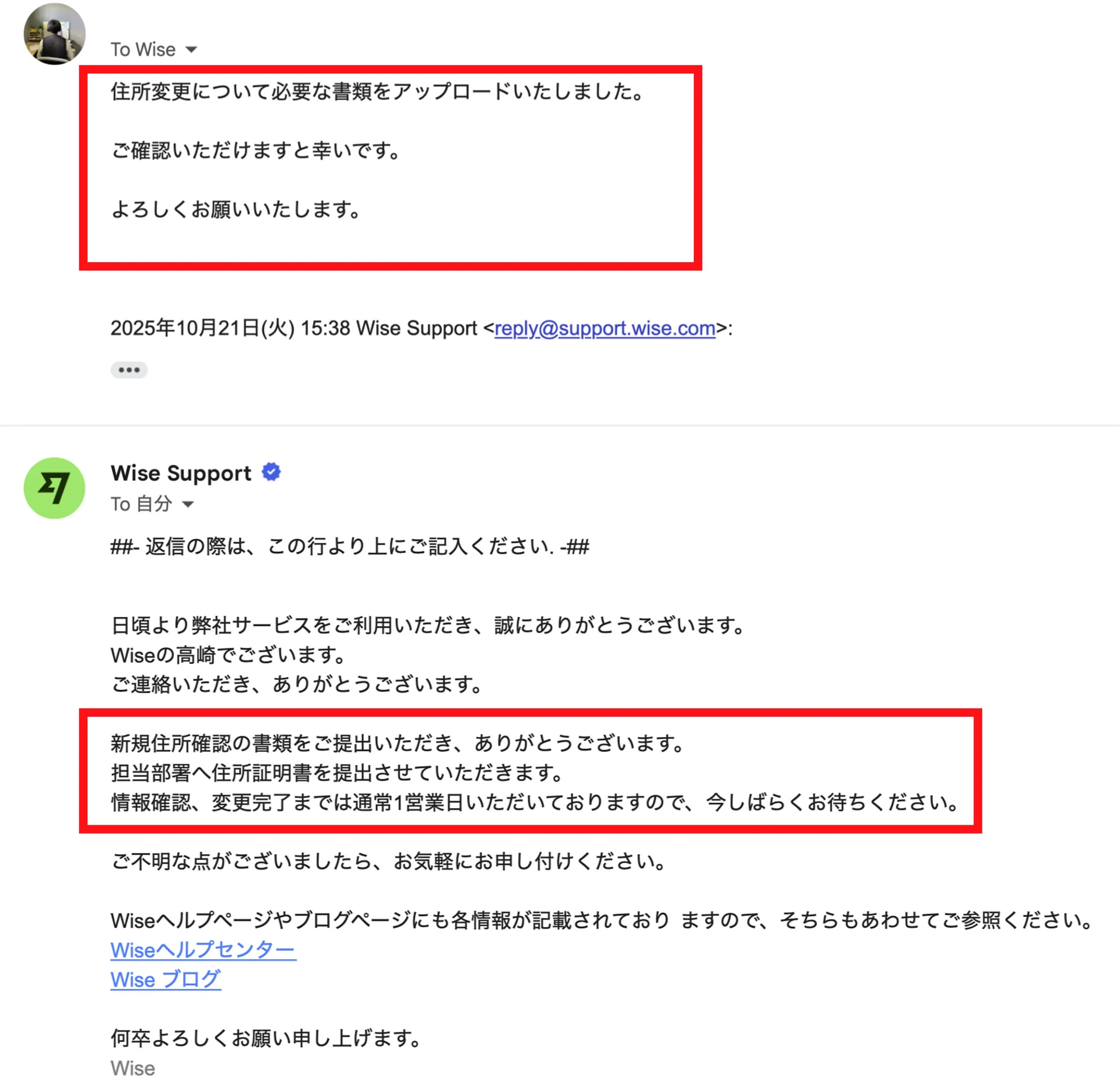 Wiseの住所変更の手続きは、2日ほどで完了しました。