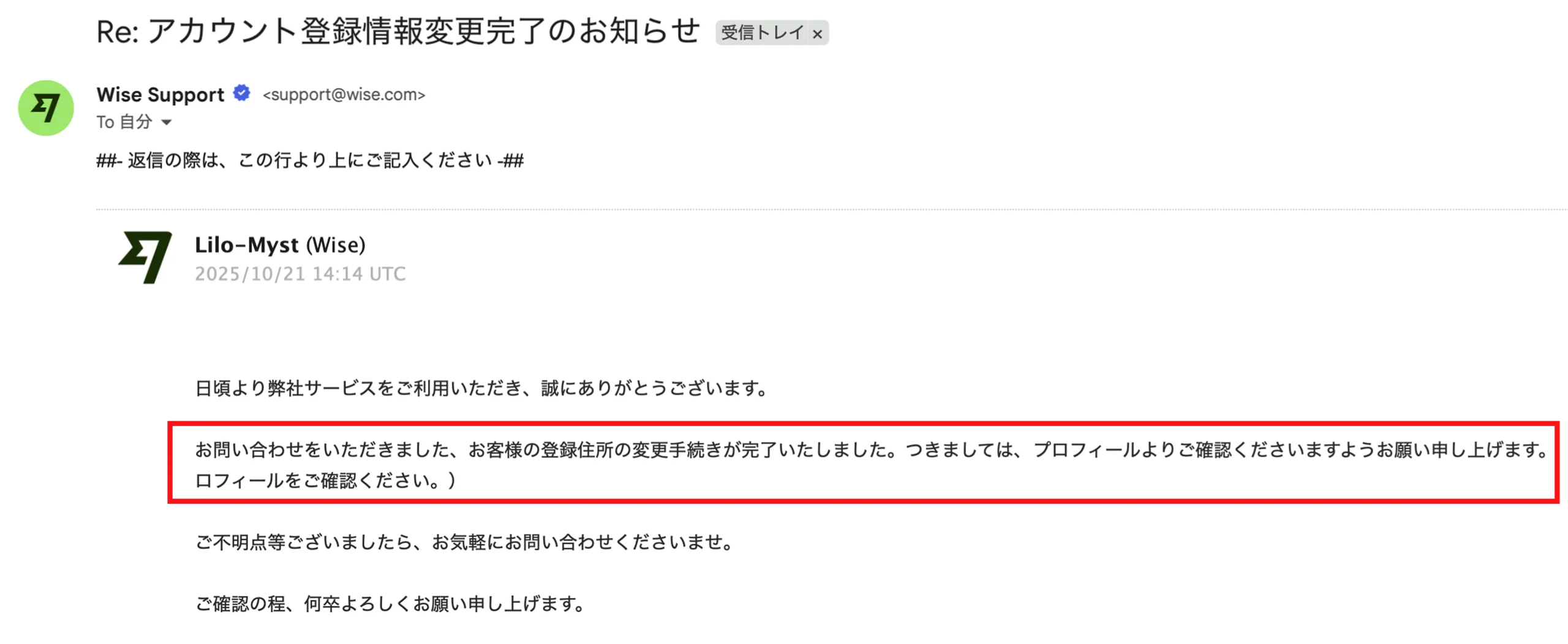 変更が完了した時点で、Wiseから改めて手続き完了のメールが届きます。